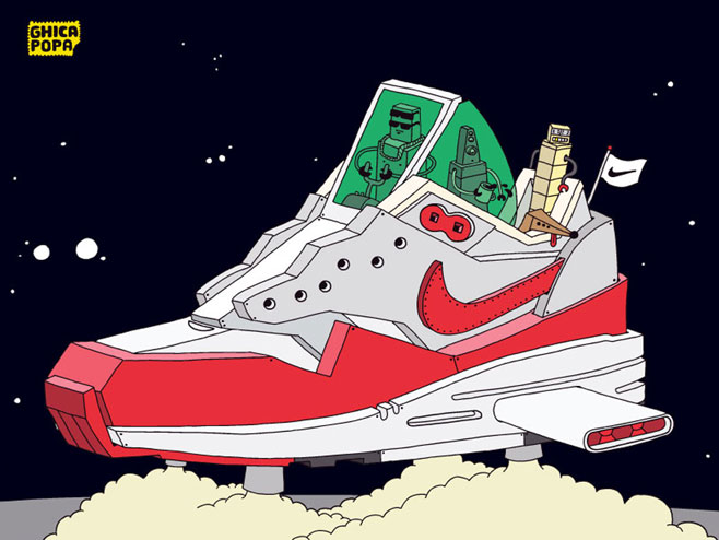 來自羅馬尼亞的藝術家 Ghica Popa,其超現實主義的風格,讓每雙鞋都搖身一變成為了有著翅膀,推進器,鐳射砲的超級戰機,而在重新繪製的過程中,依然保留了各個鞋款的特色,這些由立方體機器人駕駛的太空戰機,某種程度滿足了你對於心愛鞋款與機器人結合的想像。