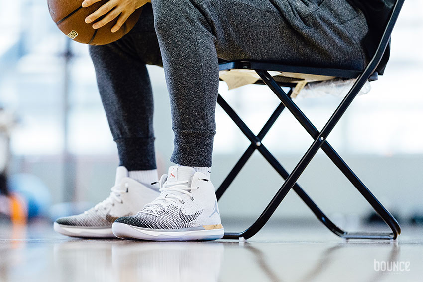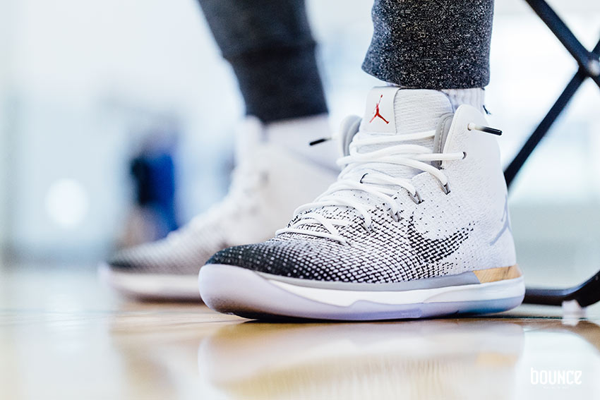 張宗憲腳上的 Air Jordan XXXI "CNY" 配色,以優雅的白灰色為底,並在鞋身細節融入東方文化傳統的竹木印花,讓球鞋在現代科技之中展現出文化底藴氣息。