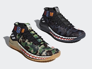 重磅聯名即將推出2017年 11月份網路便傳出 adidas 將與日本街頭潮流始祖 Bape 攜手,推出 Damian Lillard 簽名鞋款 DAME 4 聯名款式的消息。而近期國外媒體更揭露了鞋款的細節相片,據悉包含兩色的聯名款式將在 2月份正式推出。 聯名款球鞋於鞋面採用 Bape 經典鯊魚外套的迷彩花紋,並在中底部分,設計了外套帽子處的鯊魚獠牙樣式。而在球鞋靠近踝處的地方,還加入了出現在鯊魚外套上搶眼的 WGM 字樣,闡述 "World Gone Mad" 的瘋狂意境。