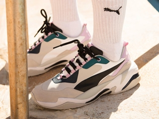 PUMA Thunder Rive Droite 奢華右岸老爹鞋全球運動 時尚品牌 PUMA 持續引領復古浪潮,將經典鞋款重新翻玩復刻推出多款震撼潮流圈的重磅時尚單品,從今年年初的 SUEDE 50 聯名系列鞋款開啟序幕,展現 80年代街頭潮流態度、重啟 RS-0 跑鞋系統,多樣色塊拼接深受年輕族群的喜愛、從去年底一直延燒到今年的老爹鞋風潮,更讓 PUMA 經典復刻 Thunder Spectra 在全球紛傳銷售捷報,其跳脫常規的色塊拼接設計,異材質混搭無極限的創意靈感,成功讓 PUMA 再次成為運動時尚圈的鞋履復刻新寵。乘著時尚復古浪潮, 2018年底 PUMA 首度與杜拜成衣品牌 LAMA JOUNI 攜手合作,推出 Thunder Rive Droite 奢華時尚老爹鞋,以浪漫巴黎右岸「Rive Droite」為名,加上今年最夯的莫蘭迪全新配色幻化而成,高雅低調的柔美氣質,為時下復刻老爹鞋注入高端奢華新氣象。此次 PUMA Thunder Rive Droite 推出河畔墨藍及楓葉湛紅兩款全新灰階色系主調,同樣以多重異材質拼接打造而成,為次世代都會女孩們打造今年冬季時尚代表鞋款。