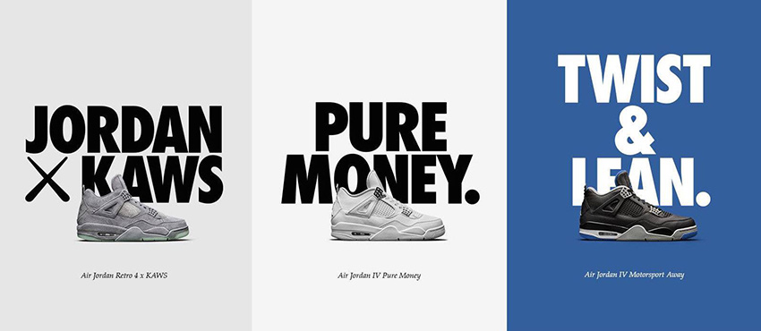 今年 AIR JORDAN IV 更在品牌 SEASON OF IV 系列活動的主導下,發表了過去僅贈給 Jordan Motorsports Team 車隊成員的 "Motorsport" 限定配色,以及繼 2006年首度回歸、滿富純淨意象的 "Pure Money",甚至是與知名潮流藝術家合作的聯名款 KAWS X AIR JORDAN IV 等配色款式。