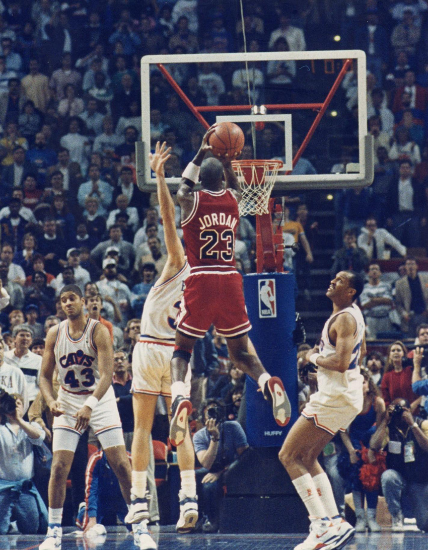Jordan 曾在 1989年 NBA 東區季後賽首輪 Game 5 施展了令世人難以忘懷的空中停留。當時以一分之差落後克里夫蘭騎士的芝加哥公牛隊雖然掌握了最後一波球權,但他們只剩下三秒的進攻時間能夠把握,Jordan 在緊迫盯人的防守下,透過假動作走位而接獲傳球,看防的 Craig Ehlo 亦步亦趨地緊跟在側,Jordan 沒有時間猶豫,接球後馬上帶步到罰球線附近,急停、躍起,而防守者 Ehlo 也在同個瞬間起跳,穿著 AIR JORDAN IV 的 Jordan 在空中平衡以後,果決但優雅地將手中的球投出,但防守者在他出手以前,卻早被地心引力拉回了地面,那個彷彿只有 MJ 時間暫停的一瞬間,不僅呈現了飛翔在空中的滯停感,也造就了留名青史的「The Shot」。